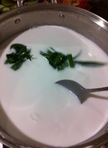 2.เติมน ม สดลงไป แล้วคนเบาๆให้เข้ากันทั้งน้ำกะทิและนม ส ด เป็นอันเสร็จเรียบร้อย