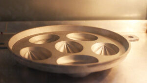 5.นำพิมพ์ขนมไข่ออกจากเตา รีบทาไขมันและหยอดขนมตอนที่พิมพ์ยังร้อนอยู่ ถ้าพิมพ์เย็นจะทำให้ขนมติดพิมพ์ พอหยอดเสร็จก็นำเข้าเตา