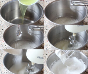 2.ตีไข่ขาวจนเป็นฟองหยาบ ใส่ครีมออฟทาร์ทาร์หรือน้ำมะนาวลงไปตีพอเข้ากัน หลังจากนั้นทยอยใส่น้ำตาลทรายลงไป แบ่งใส่สัก 3-4 รอบ