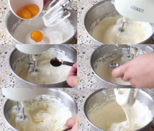 ตีจนเมอแรงค์ตั้งยอด(ป้าแยกไข่ตีเพราะมันขึ้นฟุเร็ว แต่สามารถตีไข่ทั้งฟองตามสูตรทั่วไปได้ค่ะ ที่สำคัญคือ ต้องตีให้ฟูแบบในภาพค่ะ )