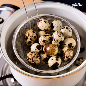 1. ใส่ไข่นกกระทาลงในหม้อ เติมน้ำเปล่าพอท่วม ใส่เกลือป่น คนเบา ๆ เพื่อให้ไข่แดงอยู่ตรงกลาง พอเดือดเบาไฟ จับเวลา 2 นาที ตักขึ้นแช่น้ำเปล่าไว้ พอเย็นสนิทจึงปอกเปลือก
