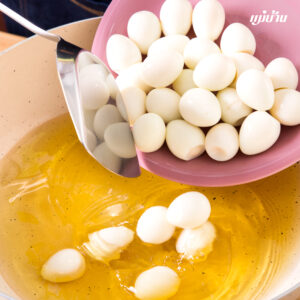 2. ตั้งกระทะใส่น้ำมันพืชพอร้อน ใส่ไข่นกกระทาลงทอดพอเหลือง ตักขึ้นพักให้สะเด็ดน้ำมัน