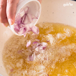 3. ใส่หอมแดงลงเจียวต่อพอเหลืองกรอบ ตักขึ้นพักให้สะเด็ดน้ำมัน ปิดไฟ แล้วใส่พริกขี้หนูลงทอดพอกรอบ ตักขึ้น