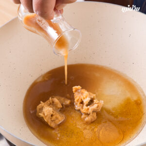 4. ใส่น้ำปลา น้ำตาลปี๊บ น้ำตาลทราย น้ำมะขามเปียก น้ำเปล่าลงในกระทะ ตั้งไฟพอเดือด เบาไฟเคี่ยวพอข้น ยกลง พักไว้ให้เย็น