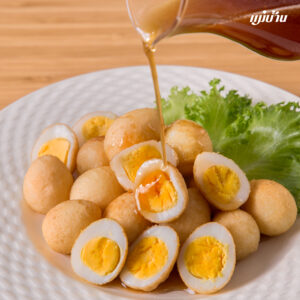 5. จัดไข่นกกระทาใส่ภาชนะ ราดน้ำที่เคี่ยวไว้ โรยหอมแดงเจียว พริกขี้หนูทอด ตกแต่งด้วยผักชี จัดเสิร์ฟ