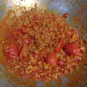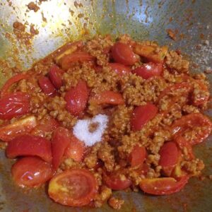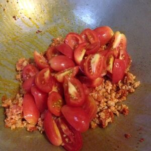 สเต็ป 5 : ใส่มะเขือเทศลงไป ผัดจนมะเขือเทศนิ่ม