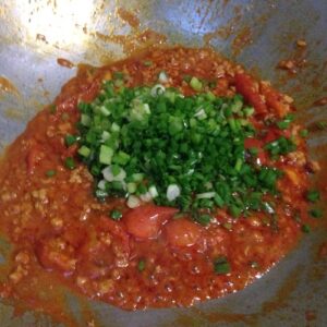 สเต็ป 8 : เติมต้นหอมซอยลงไปผัดให้เข้ากัน