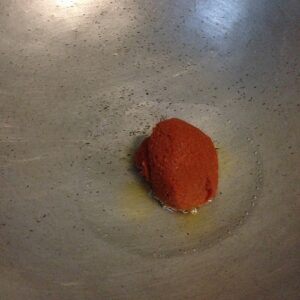 สเต็ป 3 : ใส่น้ำพริกแกงเผ็ดลงไปผัด (ควรใช้ไฟอ่อน เพราะถ้าน้ำพริกแกงไหม้จะทำให้มีรสขมค่ะ)