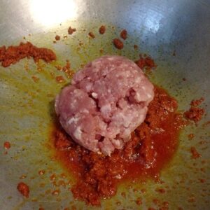 สเต็ป 4 : ใส่หมูสับลงไปผัดกับเครื่องแกง