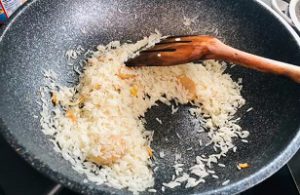 ผัดให้ข้าวเริ่มมีความแห้งสักครู่แล้วให้ปิดเตาได้เลย