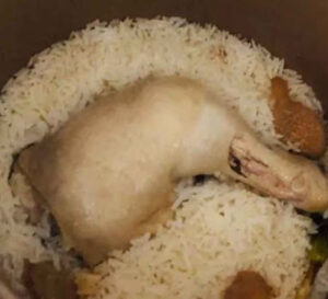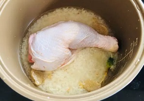 จากนั้นนำไก่ที่ได้ล้างเสร็จเป็นที่เรียบร้อยใส่ลงไปวางบนข้าวได้เลย แล้วทำการหุงข้าวได้ตามปกติเลย