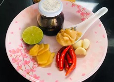 เต้าเจี้ยว , น้ำตาลปี๊บ , น้ำตาลทราย , ขิงแก่ , กระเทียม , พริกขิ้ห นู , มะนาว , น้ำกระเทียมดอง
