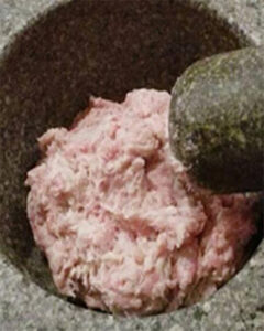 3.นำออกมาตำๆนวดๆกับครก หรือ ปั่นกับเครื่องปั่น (ใครไม่มีเครื่องปั่น ลองตำครกดูนะค่ะ)จนเนื้อแน่นหนึบและเหลวจนเป็นเนื้อเดียวกัน