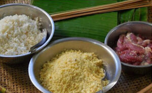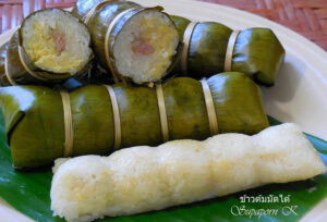 1.ข้าวเหนียว 4 ถ้วย (ล้างแล้วแช่น้ำไว้ 4 – 6 ชม. )