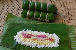 -ตักข้าวใส่ใบตอง ตามด้วยไส้ถั่ว และหมู ห่อให้เป็นกลีบยาว ใช้ตอกมัดให้แน่น แล้วนำไปต้มในน้ำเดือด 1 ชม.