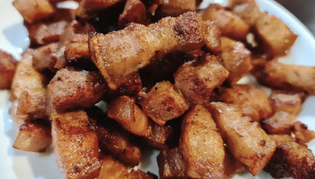 ใส่หมูในกระทะเทฟล่อน เทน้ำลงไปแค่เกือบท่วมหมู เปิดไฟ ผัดไปเรื่อยๆ จนน้ำแห้ง