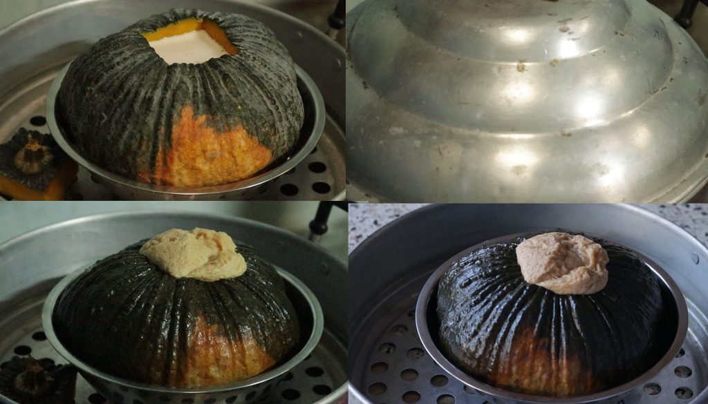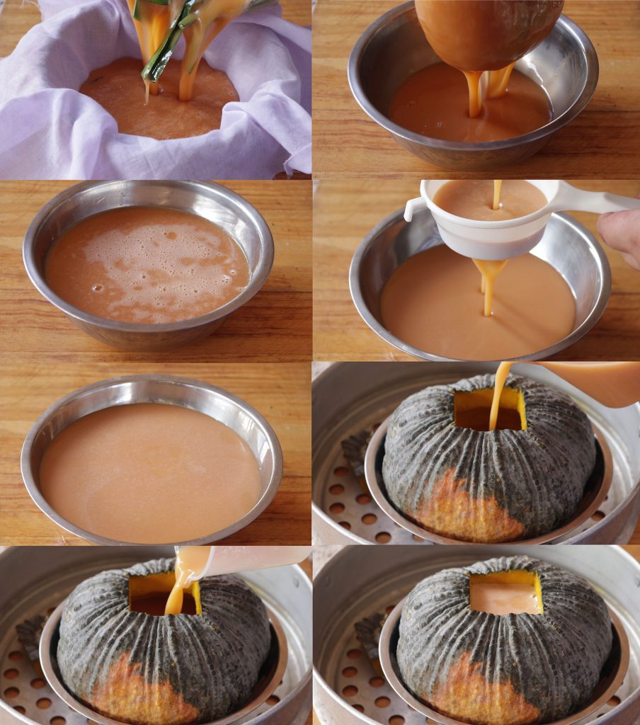 จากนั้นเทใสลงไปในฟักทองที่ควักไส้แล้ว รองด้วยชาม