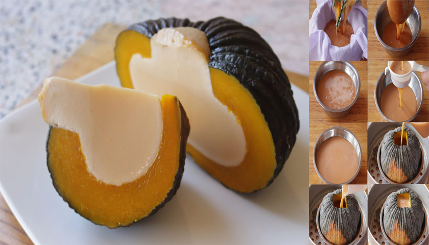 จากนั้นเทใสลงไปในฟักทองที่ควักไส้แล้ว รองด้วยชาม