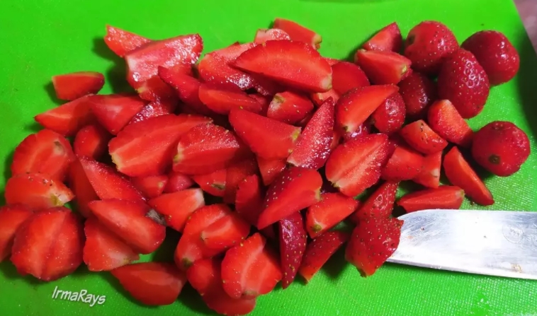 1.ล้างสตรอเบอร์รี่ หั่นเป็น 4 ส่วน