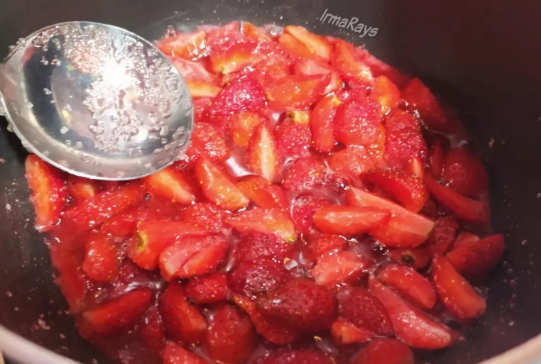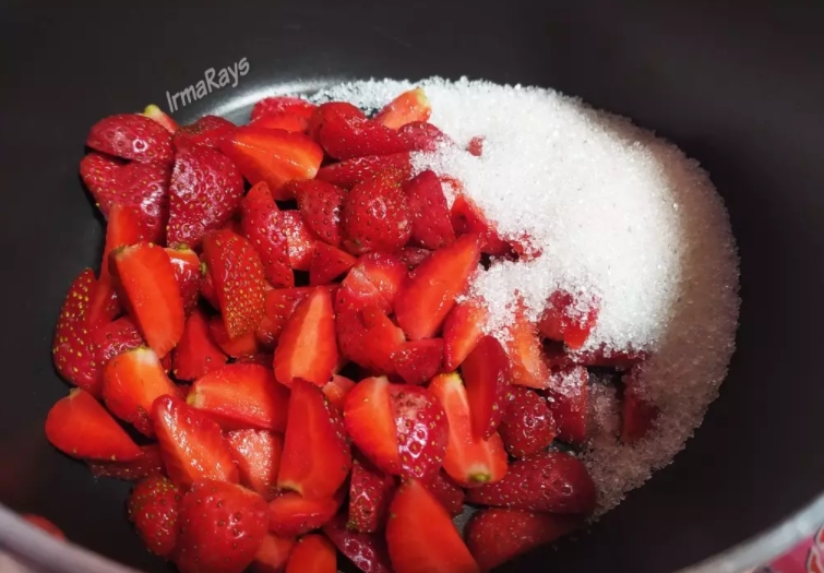 2.นำสตรอเบอรี่ลงกะทะ ตั้งไฟอ่อนปานกลาง ใส่น้ำตาลลงไป