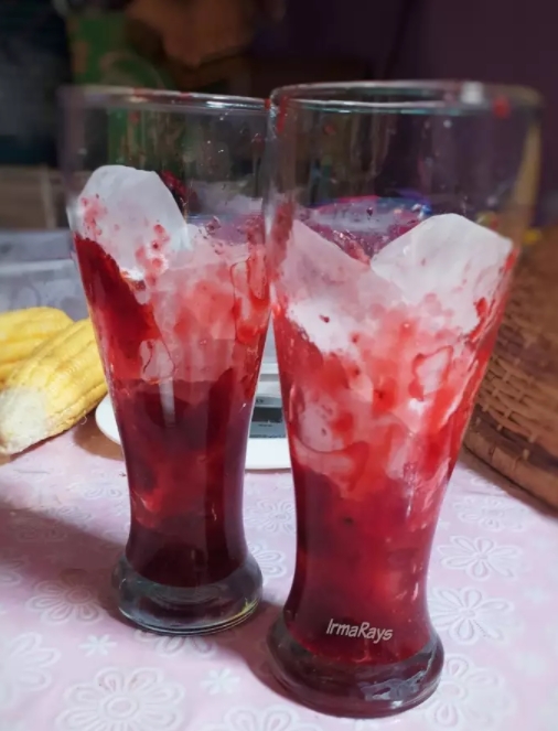 4.ใส่แยมสตรอเบอรี่ 2-3 ช้อนโต๊ะลงในแก้ว ใส่น้ำแข็ง เทนมสดลงในแก้ว