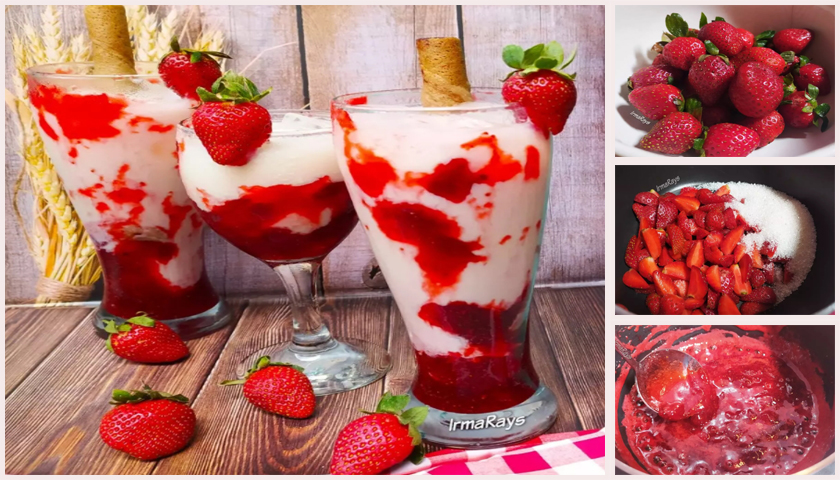 4.ใส่แยมสตรอเบอรี่ 2-3 ช้อนโต๊ะลงในแก้ว ใส่น้ำแข็ง เทนมสดลงในแก้ว