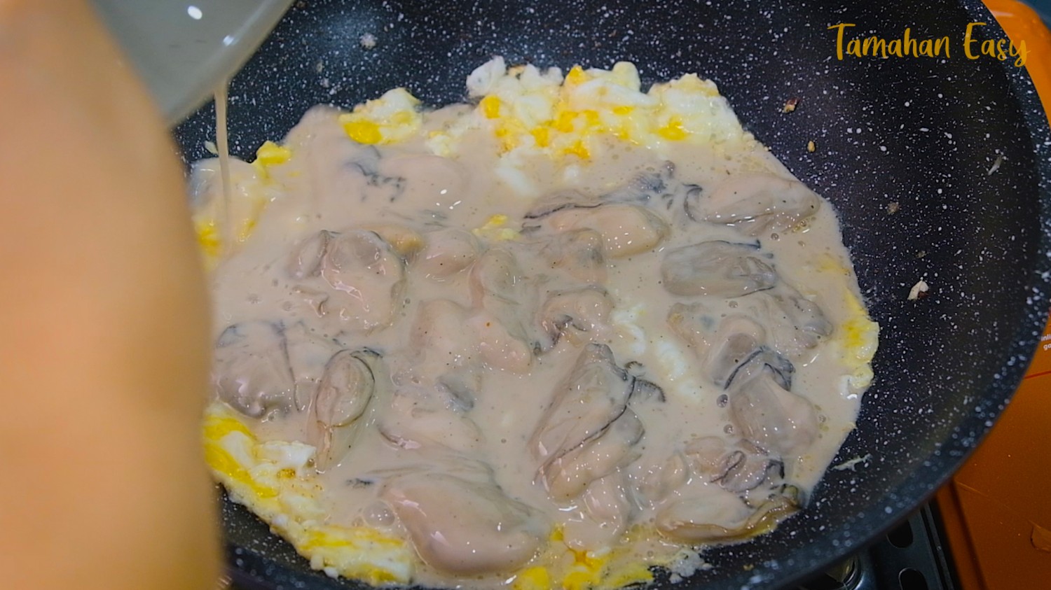 20. พอไข่ไก่เริ่มสุกปานกลาง ก็ใส่น้ำแป้งหอยนางรมลงไปในกระทะ ย้ำว่าตอนนี้ใช้ไฟแรง
