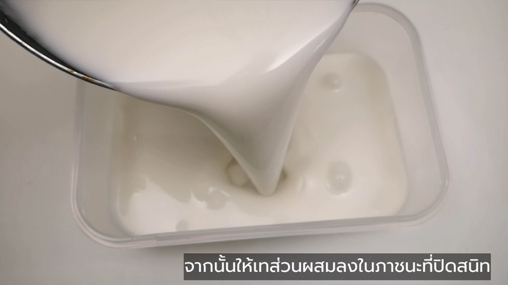 7. ยกลงจากเตาแล้วพักไว้ให้เย็นสนิท เมื่อเย็นสนิทแล้วก็เทใส่ภาชนะที่มีฝาปิดสนิท แล้วนำไปแช่ช่องฟรีซประมาณ 6 ชั่วโมง