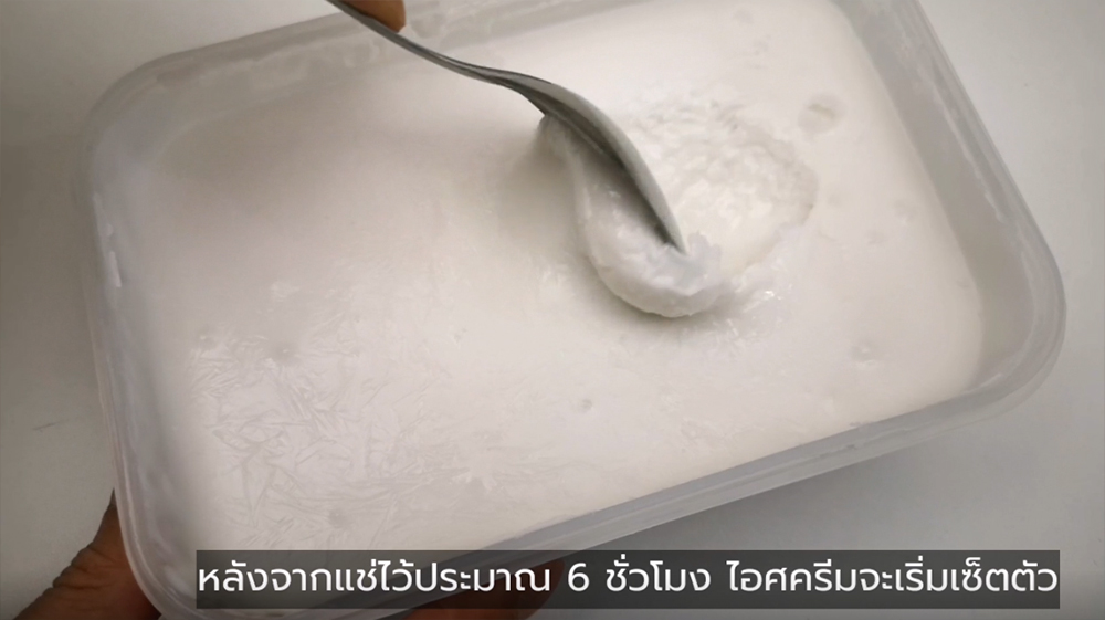 8. ครบ 6 ชั่วโมงแล้ว ให้เอาออกมา ไอศครีมจะเริ่มเซ็ตตัวได้เนื้อประมาณในภาพ