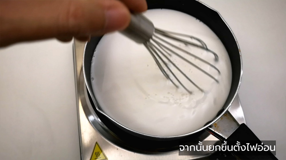 ใช้เวลาประมาณ 8-10 นาที ให้สังเกตว่าส่วนผสมจะข้นขึ้น แสดงว่าแป้งสุกแล้ว