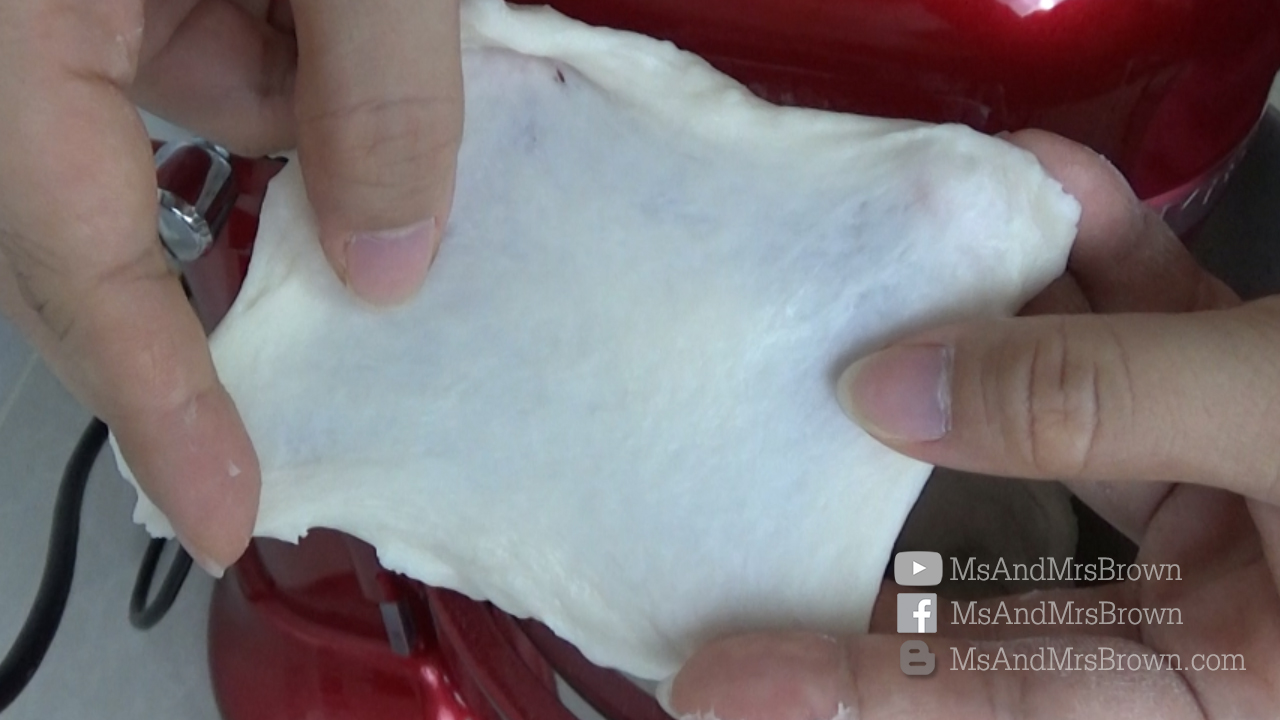 5. เช็คแป้งโดว์ว่านวดได้ที่หรือยัง โดยทำการดึงแป้งออกมาส่วนนึง มาลองขึงเป็นฟิล์ม ถ้าขึงได้ถือว่าใช้ได้