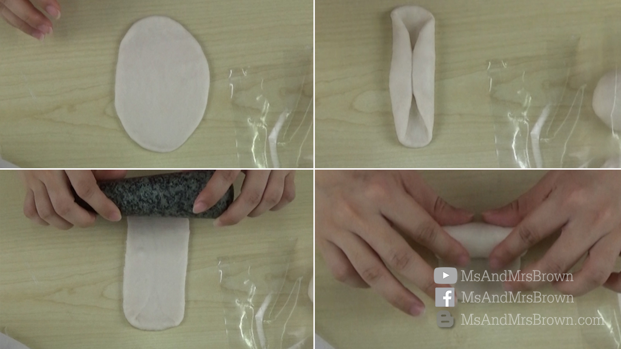 และด้านขวา เข้ามาตรงกลาง และรีดแป้งอีกครั้ง จากนั้นก็ม้วนแป้งจากมุมล่างขึ้นมาด้านบน