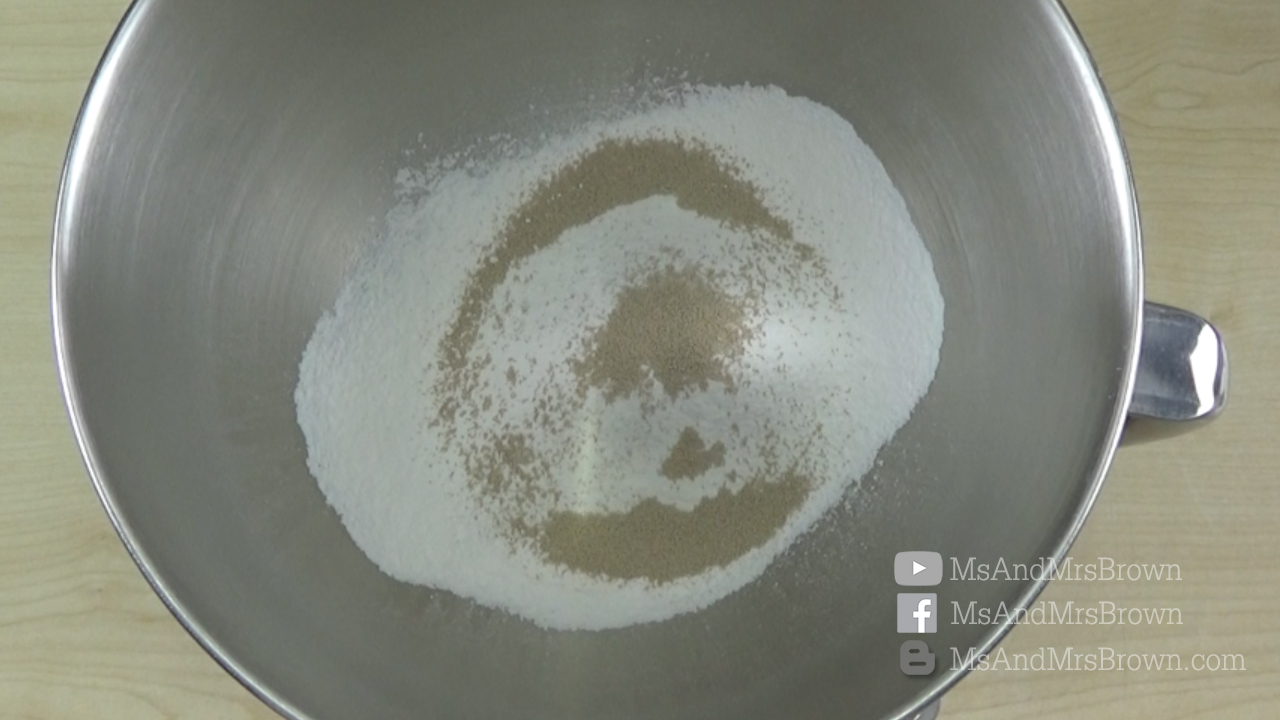 1. ร่อนแป้งซาลาเปาลงในโถผสม แล้วใส่ยีสต์ลงไป