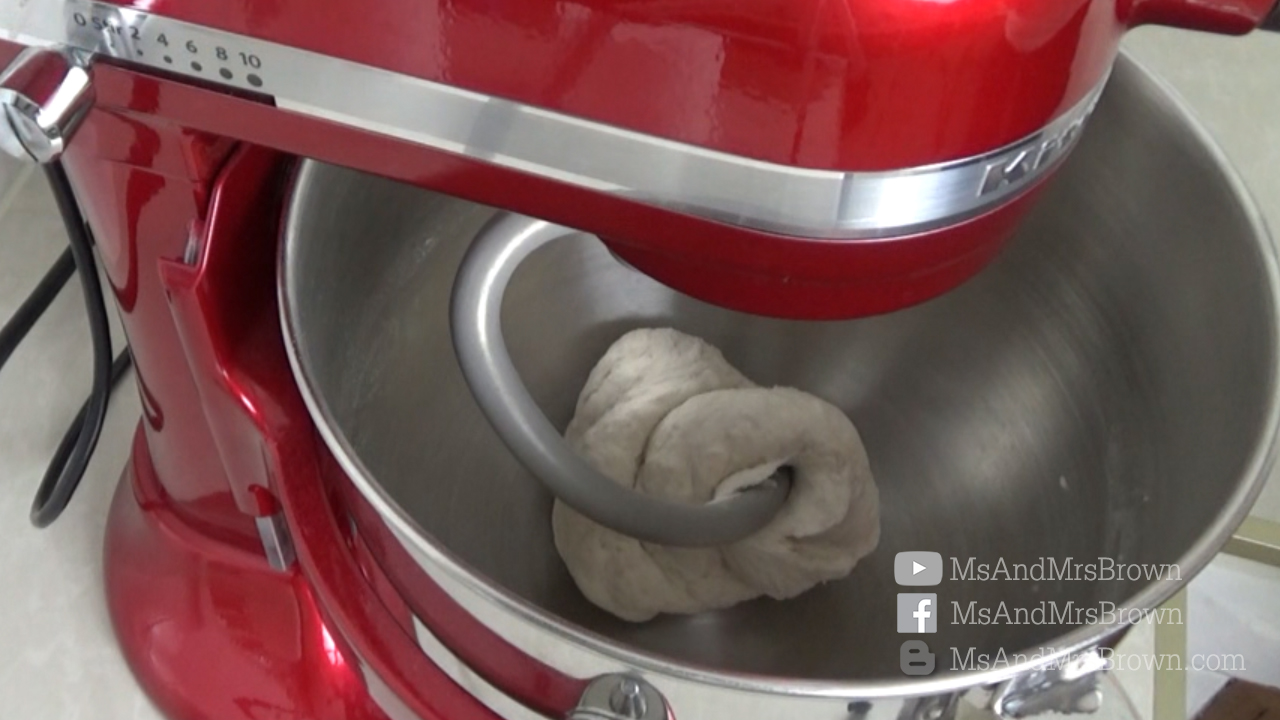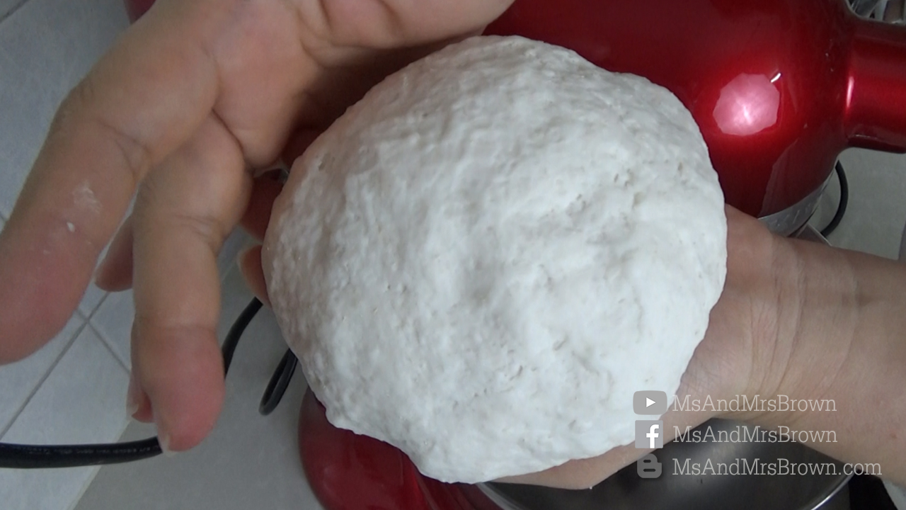 2. ใส่น้ำอุ่นลงไปในโถผสม นวดให้เข้ากันเป็นก้อนเดียว ใช้เครื่องนวดสปีด 3 ใช้เวลาประมาณ 2-3 นาที