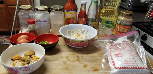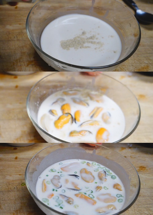 3. เติมพริกไทยป่น ใส่หอยแมลงภู่ และต้นหอมซอย คนให้เข้ากันค่ะ