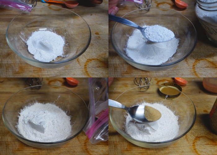 1. นำแป้งทอดกรอบ แป้งเท้ายายม่อม และแป้งข้าวเจ้ามาใส่ถ้วยผสม ตามสูตรที่ให้ไว้นะคะ ใส่ผงปรุงรสนิดหน่อย ตามสูตรค่ะ