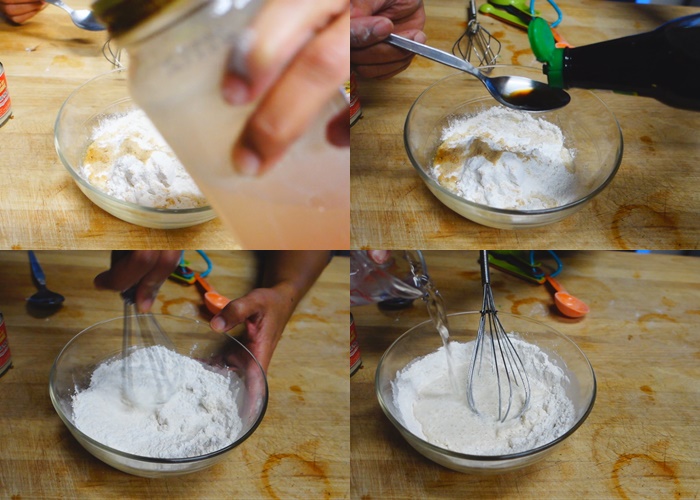 2. ใส่น้ำปูนใส (ทำให้กรอบนาน) ใส่ซอสปรุงรส คนแป้งให้เข้ากัน และ เติมน้ำ คนส่วนผสม ไม่ให้ใสเกินไป ไม่ให้ข้นเกินไปนะคะ