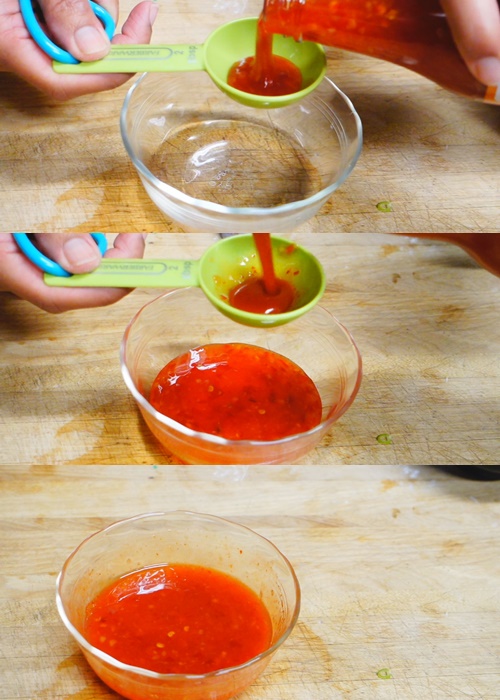 4. เติมน้ำจิ้มไก่สำเร็จรูป ผสมกับซอสพริก ตามสูตรที่ให้ค่ะ