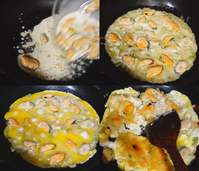 ก็ตอกไข่ใส่แล้วยีไข่ให้ทั่ว ๆ ทอดไฟกลาง ๆ รอจนด้านหนึ่งสุก ก็เตรียมกลับด้าน การทอดหอยไม่จำเป็นต้องให้เป็นแผ่น นะคะ