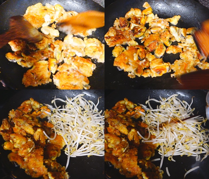 6. เมื่อหอยทอดกรอบแบบที่อยากได้แล้ว ก็เกลี่ยหอยที่กรอบ ๆ ไว้ด้านนึง นำถั่วงอกมาผัด ใส่ซอสซีอิ๊วขาว หรือ ซอสปรุงรสก็ได้ค่ะ