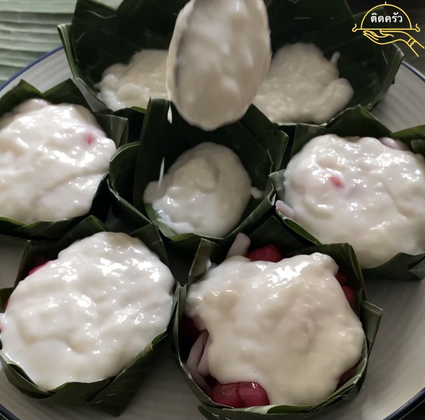ตักใส่กระทงใบตองจะโชว์หน้าทับทิมหรือโชว์หน้ากะทิ ก็ได้ตามชอบ