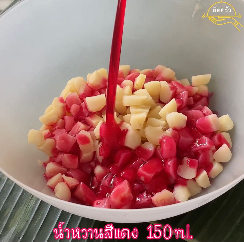 นำแห้วที่หั่นมาแช่กับน้ำหวานสีแดง พักไว้ประมาณ20นาที