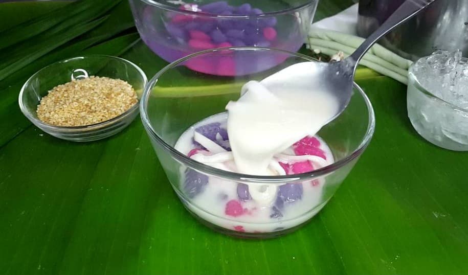 ตักครองแครงใส่ถ้วย หรือลูกมะพร้าว ตามด้วยกะทิ โรยงาเล็กน้อย เตรียมเสิร์ฟ กันเลย หรือใครชอบแบบเย็นตามด้วยน้ำแข็งเล็กน้อย