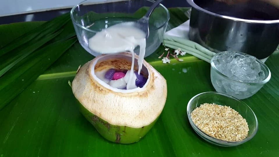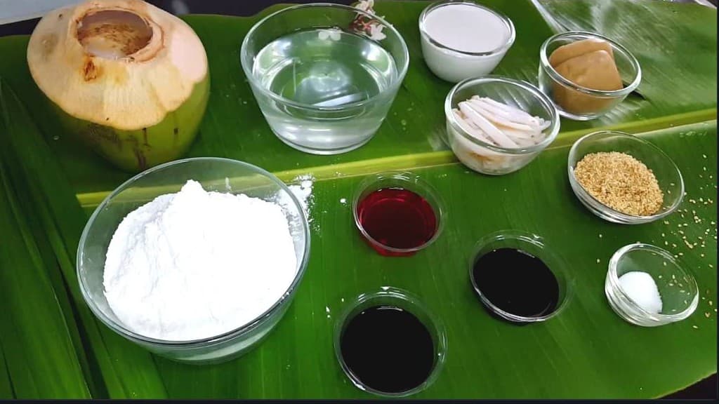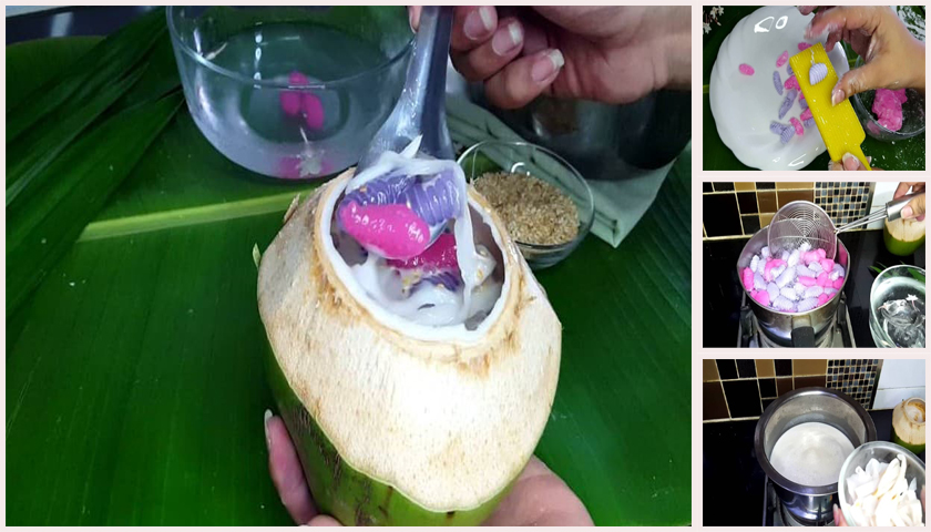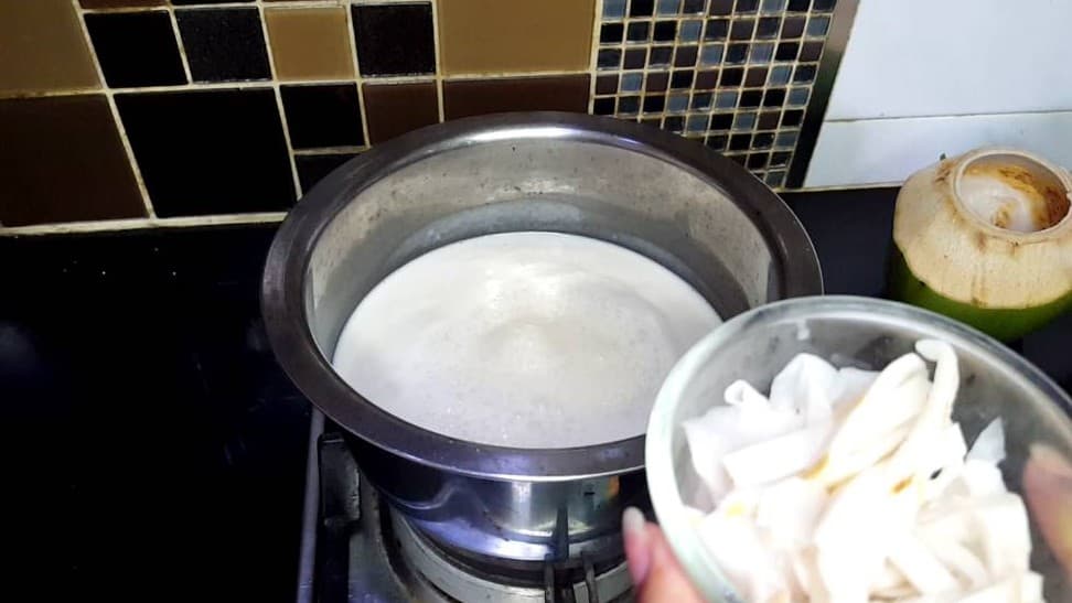 นำน้ำมะพร้าวใส่ในหม้อ ตามด้วยกะทิแล้วตั้งไฟอ่อนๆ ตามด้วยน้ำตาลมพะร้าว และตามด้วยเกลือ
