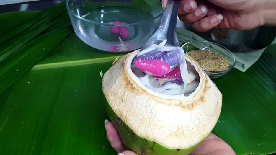 หลังจากกะทิเริ่มเดือดใส่เนื้อมะพร้าว รอให้เดือดอีกครั้งยกลง เตรียมเสิร์ฟ