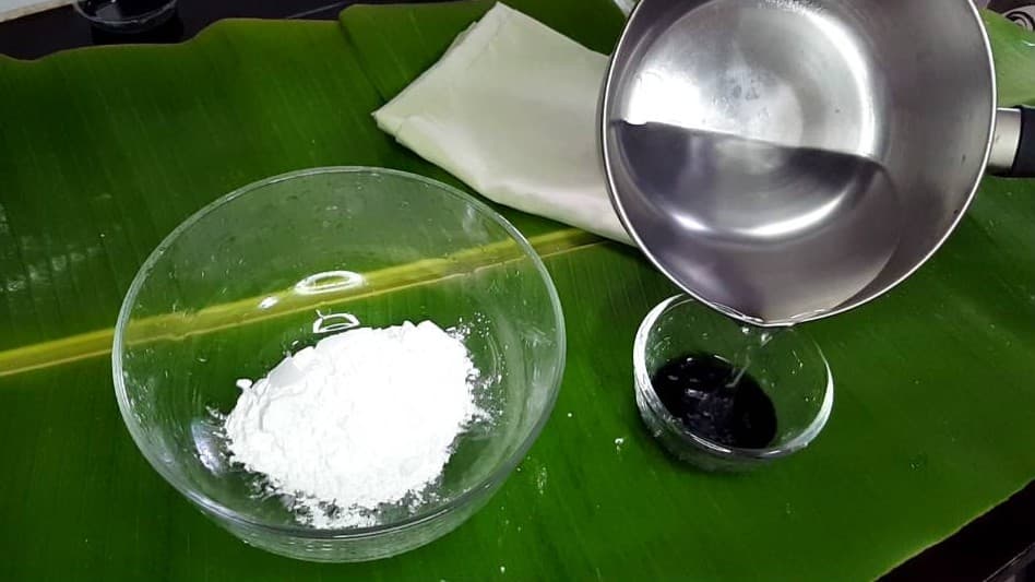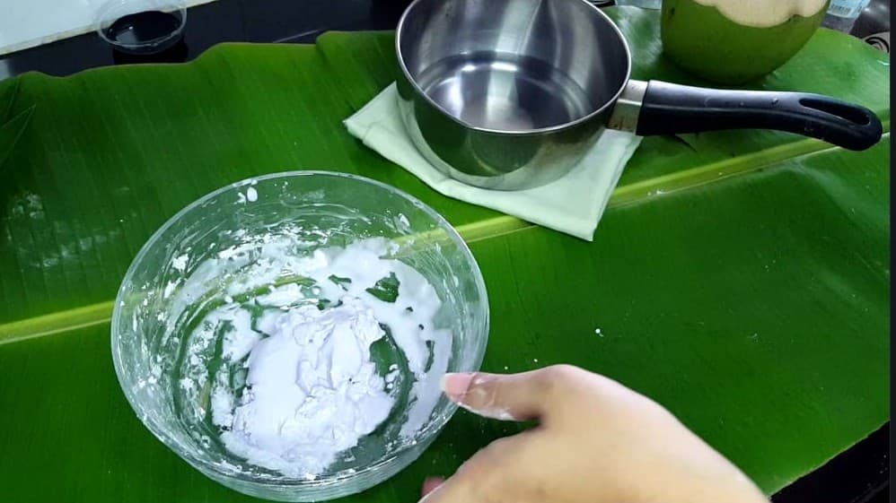 1.ตั้งน้ำบนเตา ให้ เดือดจัด หลังจากนั้นยกลงเตรียม นำไปผสมกับแป้ง
