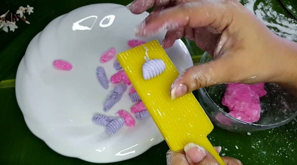3.นำแป้งที่ได้มารีดตัวครองแครง รีดเบาๆ จะได้ตัวครองแครงที่สวย และขนาดน่ารับประทาน