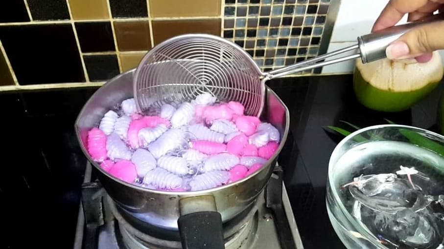 4.ตั้งน้ำร้อนให้เดือด แล้วนำตัวครองแครงของเราใส่ไปต้ม จนตัวครองแครงลอย แดงว่าสุกได้ที่แล้ว ใช้กระชอนตักลงมาแช่ในน้ำเย็น