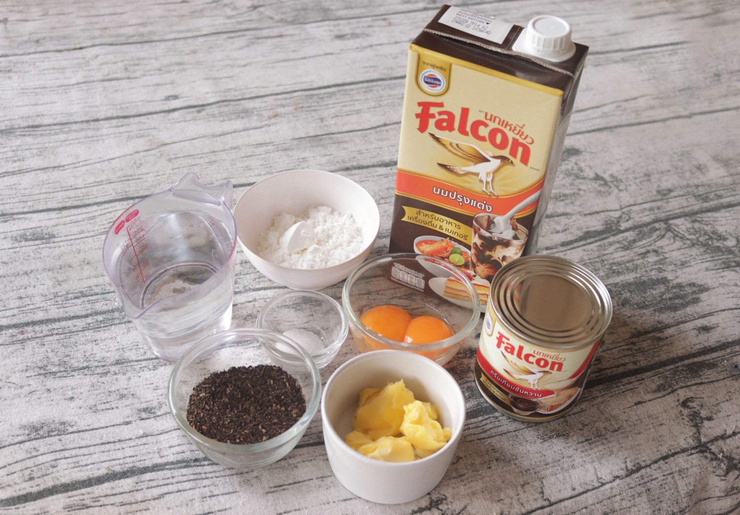 3. เทนมข้นจืดตรานกเหยี่ยวฟอลคอลลงไปในชามผสม ตามด้วยน้ำชาไทย คนให้ส่วนผสมเข้ากัน