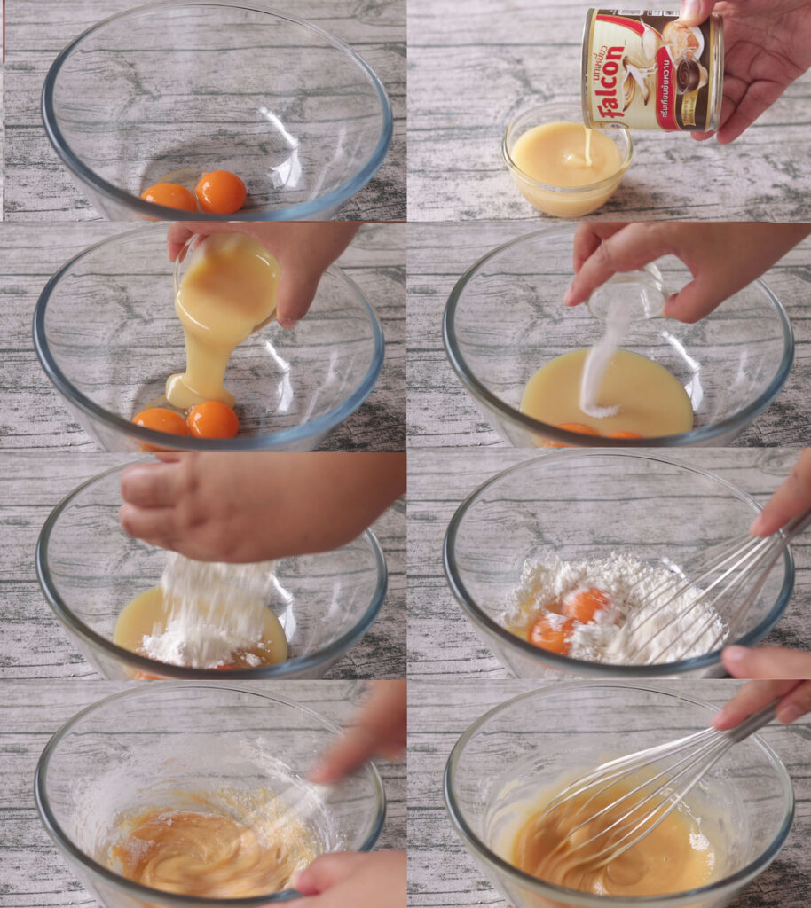 2. ตีไข่กับครีมเทียมข้นหวานตราฟอลคอน เกลือป่น และแป้งข้าวโพด จนเข้ากัน